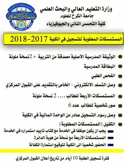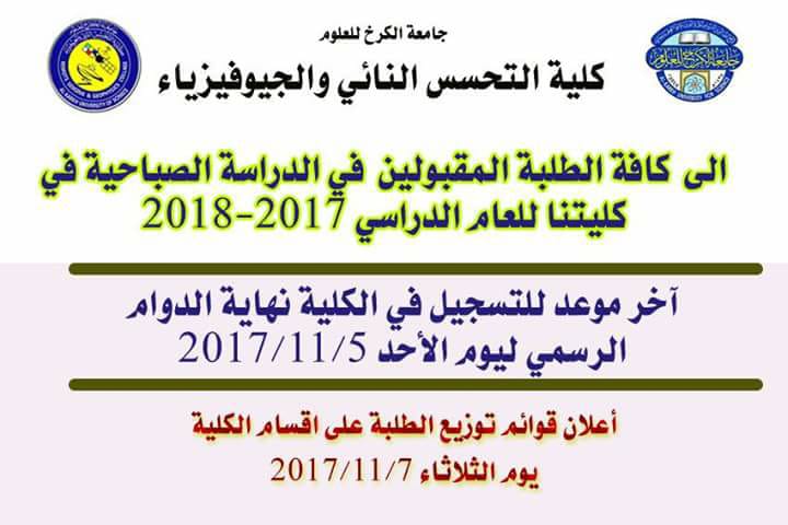 تعلن كلية التحسس النائي والجيوفيزياء بجامعة الكرخ للعلوم عن فتح باب التسجيل للطلبة المقبولين في الكلية للعام الدراسي 2017-2018 , فعلى الطلبة المقبولين مراجعة مقر الجامعة الكائن في شارع حيفا قصر منطقة الجعيفر (قصر حمادة) قرب كازينو البيروتي مستصحبين معهم المستمسكات المطلوبة للتسجيل علما ان فترة التسجيل تستمر لمدة 10 أيام من تاريخ إعلان القبول المركزي.