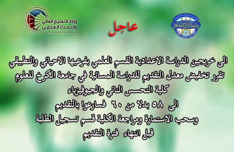 الى خريجين الدراسة الاعدادية القسم العلمي بفرعيها الاحيائي والتطبيقي تقرر تخفيض معدل التقديم للدراسة المسائية في جامعة الكرخ للعلوم كلية التحسس النائي والجيوفيزياء الى 58 بدلا من 60 فسارعوا بالتقديم وسحب الاستمارة ومراجعة الكلية قسم تسجيل الطلبة قبل انتهاء فترة التقديم .