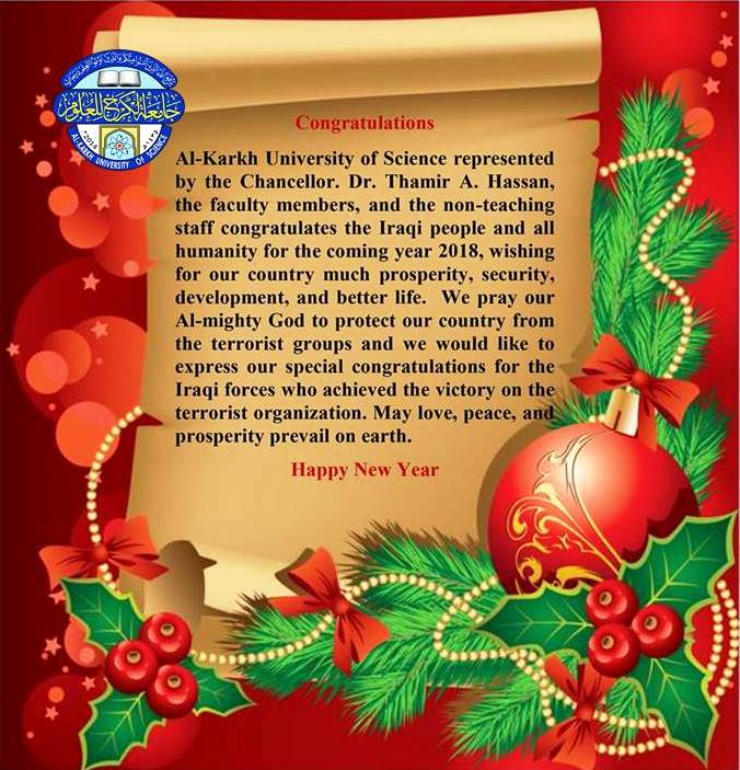 Al-Karkh University of Science represented by the Chancellor Dr. Thamir A. Hassan the faculty members, and the non-teaching staff congratulates the Iraqi people and all humanity for the coming year 2018, wishing for our country much prosperity ,security , development and better life.