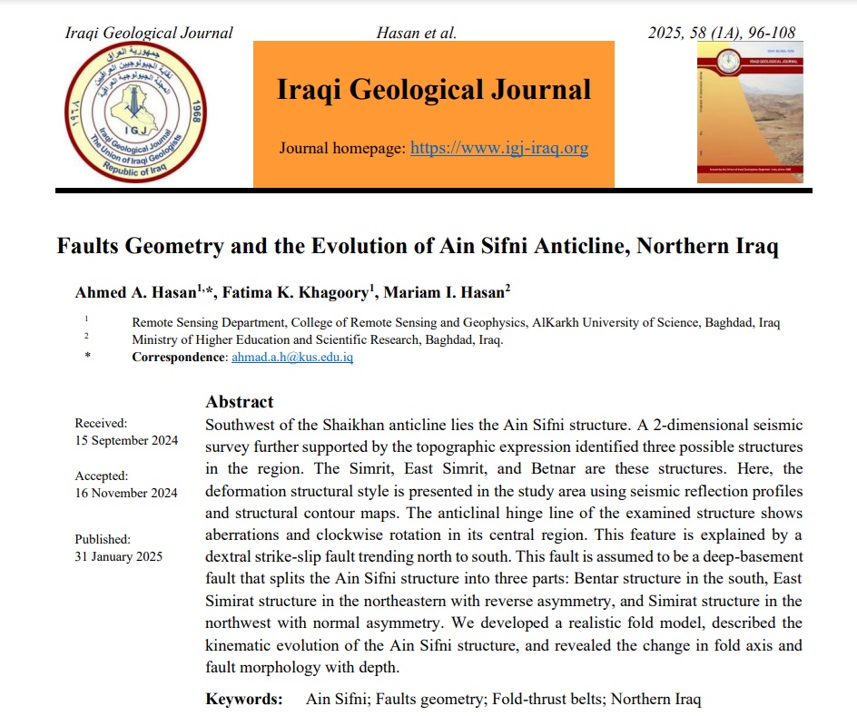 يسر كلية التحسس النائي والجيوفيزياء أن تعلن عن إنجاز علمي جديد حققه الأستاذ المساعد الدكتور أحمد عباس حسن، عميد الكلية، بالتعاون مع م.م. فاطمة كريم خجوري، حيث تم نشر بحث علمي بعنوان “Faults Geometry and the Evolution of Ain Sifni Anticline, Northern Iraq” في المجلة الجيولوجية العراقية المصنفة ضمن مستوعبات سكوباس Q3.