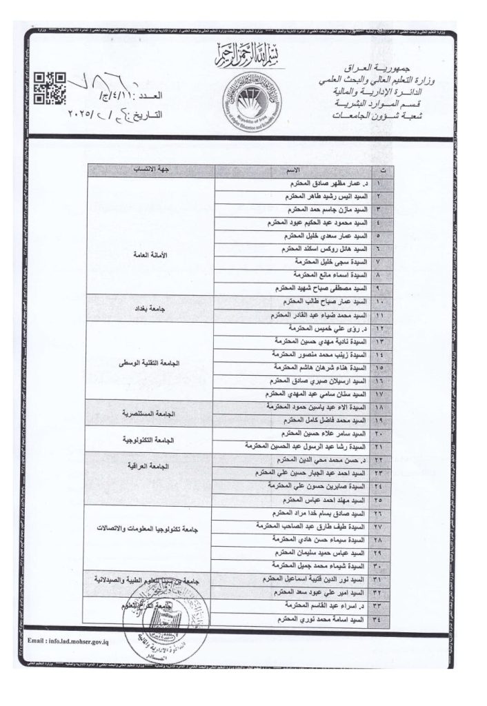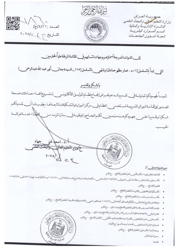 تدريسية في كلية التحسس النائي والجيوفيزياء تنال كتاب شكر وتقدير من وزير التعليم العالي