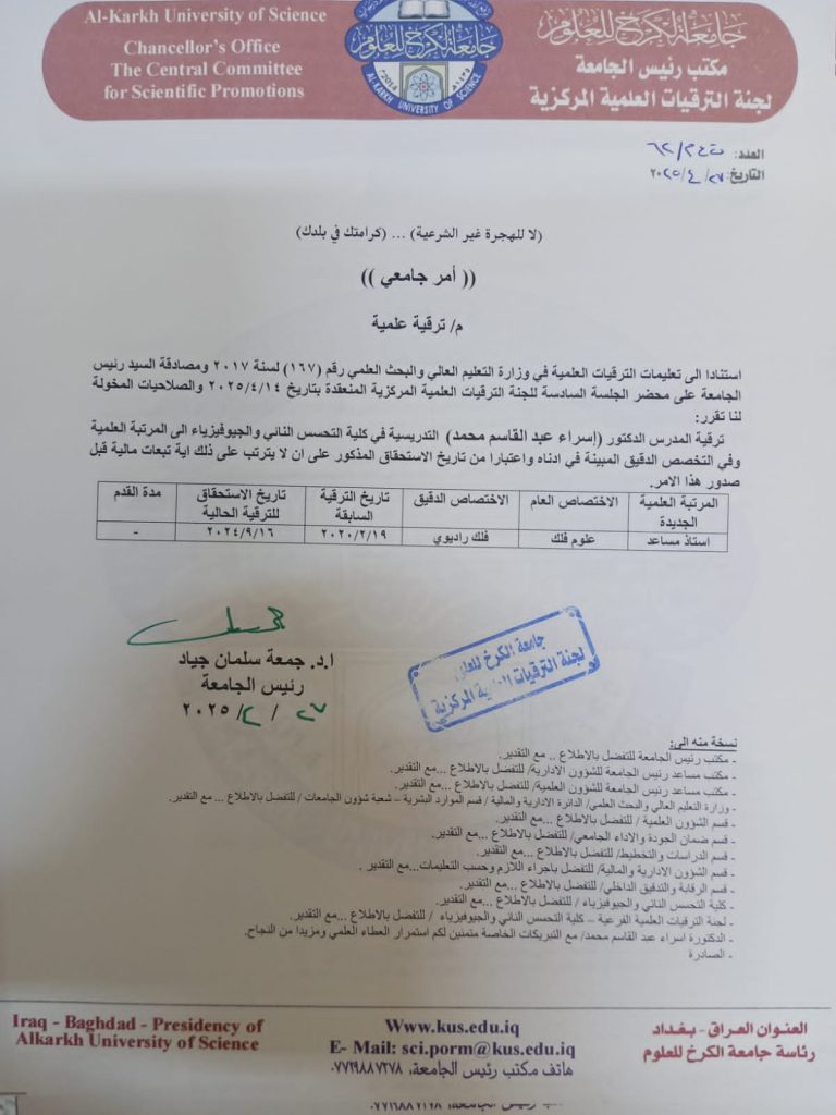 نتمنى للدكتورة إسراء عبد القاسم مزيدا من التقدم والنجاح في مسيرتها العلمية، ومزيدا من العطاء في خدمة التعليم العالي في عراقنا العزيز