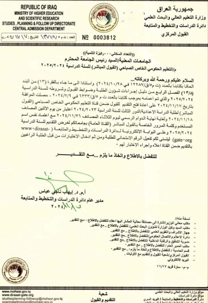 حصلت موافقة وزارة التعليم العالي والبحث العلمي على إعادة فتح التقديم للقبول ضمن قناة التقديم الحكومي الخاص الصباحي (القبول المباشر) لطلبة الدراسة الإعدادية/ الدور الثالث للعام الدراسي 2023-2024.