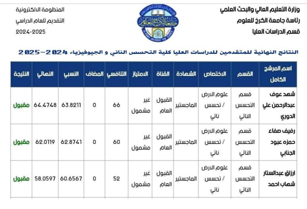 النتائج النهائية للمتقدمين للدراسات العليا في كلية التحسس النائي والجيوفيزياء 2024-2025 Categories لوحة الاعلانات Date أغسطس 4, 2024 Share: Media Dept Previous post جامعة الكرخ للعلوم تعلن عن نتائج الترشيح الاولي للقبول في الدراسات العليا أغسطس 4, 2024 Next post إشراف ومناقشة رسالة ماجستير في هندسة النفط أغسطس 19, 2024 You may also like إعلان هام | إطلاق جدول مراقبات امتحانات الدراسات العليا 18 ديسمبر, 2025 كلية التحسس النائي والجيوفيزياء تعلن نتائج القبول الأولي للمتقدمين إلى الدراسات العليا للعام الدراسي 2025–2026 10 يوليو, 2025 إعلان أسماء المشمولين بأداء الامتحان التنافسي للعام الدراسي 2025–2026 22 يونيو, 2025